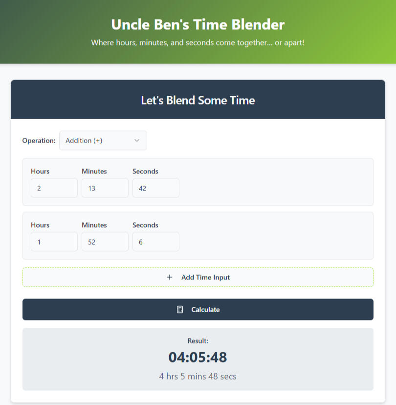 We built a custom time calculator for a nurse coach who needed a quick way to track how long her teams spent on clinical training activities. It’s clean, easy to use, and solves a real workflow problem — the kind of practical tool we can build for your business too.